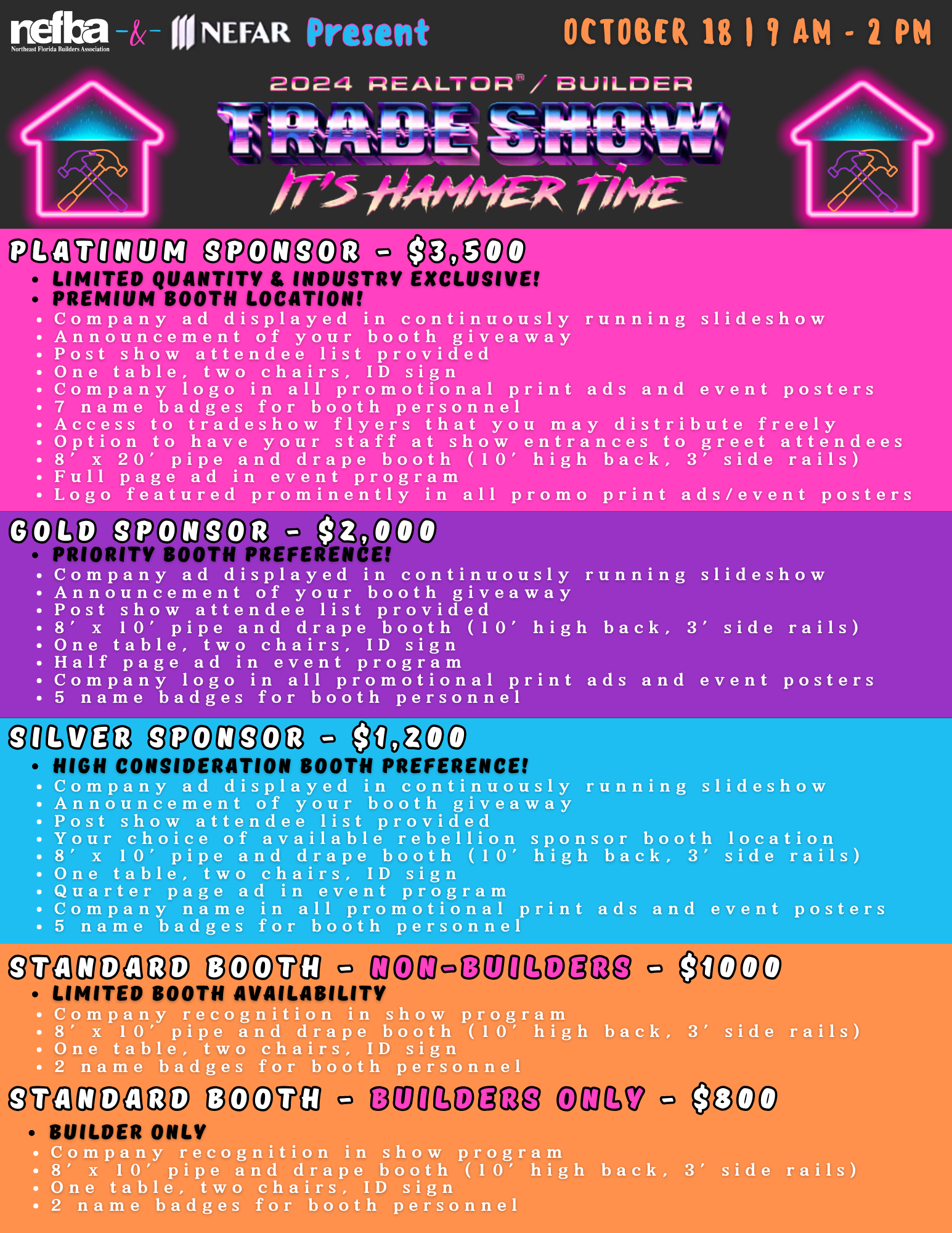 EXHIBITORS: CLICK HERE TO PURCHASE YOUR BOOTH FOR THE 2024 REALTOR BUILDER TREADESHOW or CONTACT Ashley Hartley at ahartley@nefba.com.