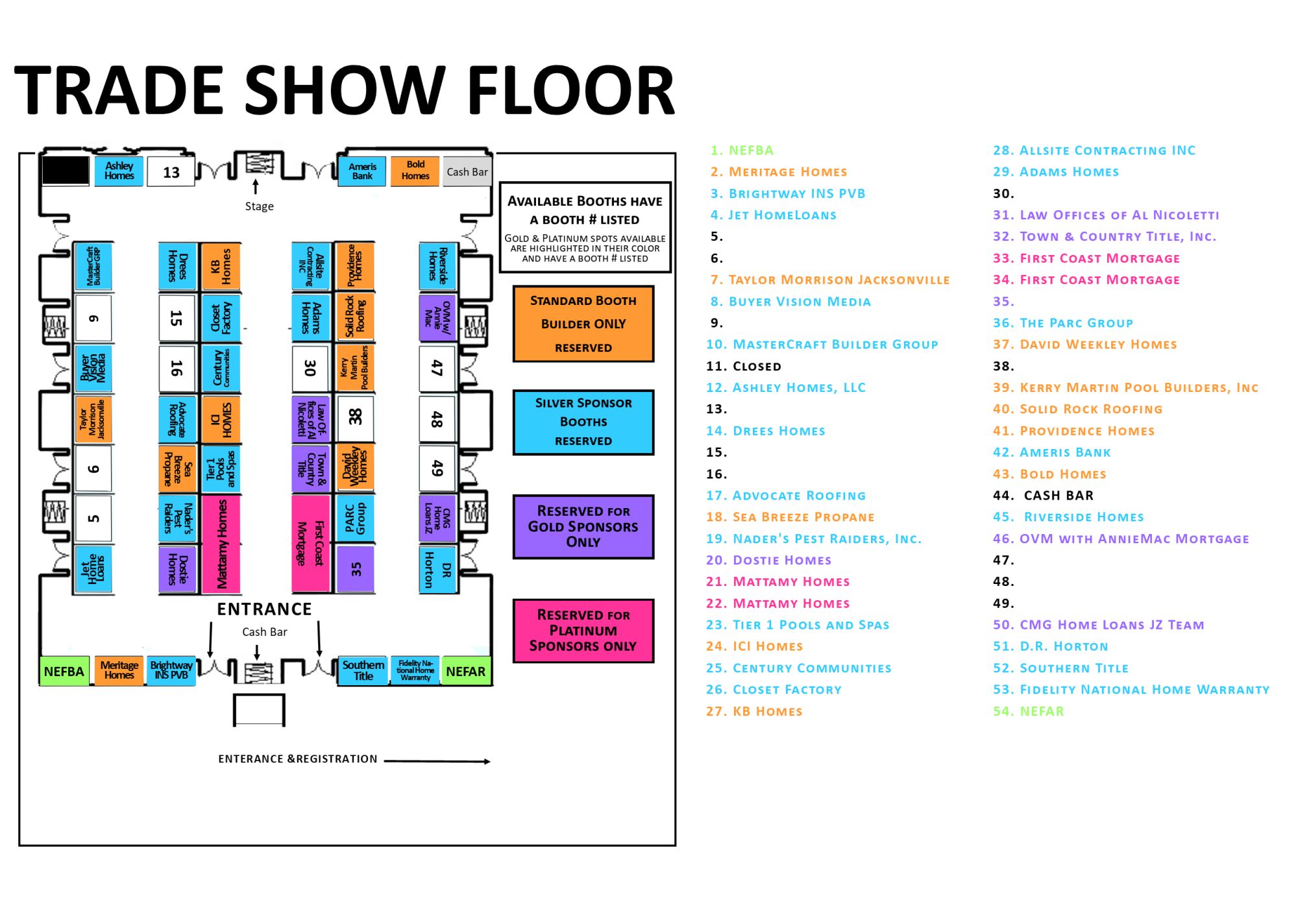 Associate (non-Builder) booths are limited to 1 associate booth per trade per sponsorship level. No standard booth option for non-builder unless this is your first year exhibiting with us. For example: 1 lender for Platinum, 1 lender for Gold, and 1 lender for Silver; with no standard booth option unless its a first time lender exhibiting.