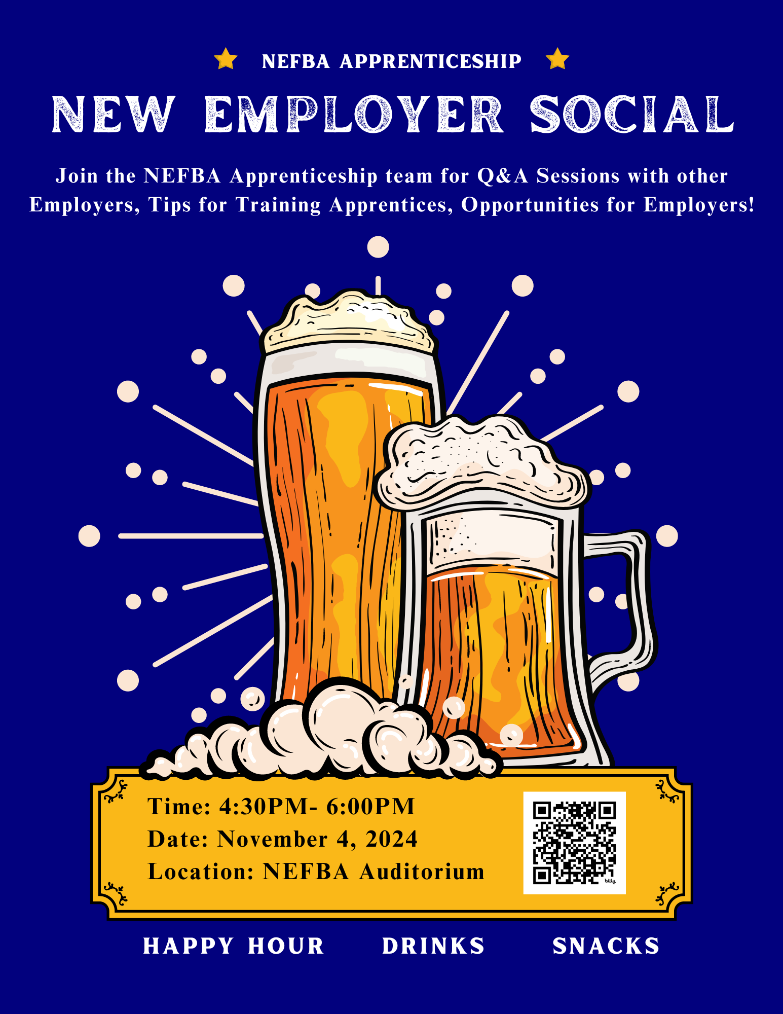 Participating employers with the NEFBA Apprenticeship program are invited to attend one of our monthly NEFBA Executive Committee meetings followed by a brief informational session and a social happy hour. No cost to attend. Employers are highly encouraged to attend.