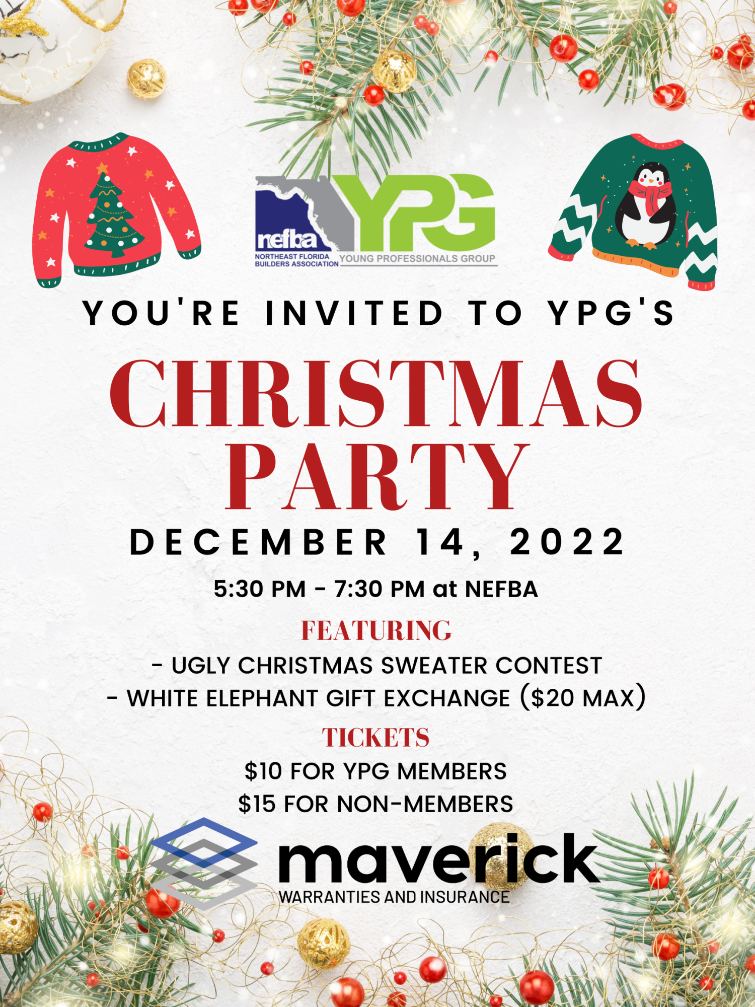 Join NEFBA's Young Professionals Group (YPG) for our first Annual Christmas Party! A ticket includes food and drinks, as well as entry into the Ugly Christmas Sweater Contest. If you want to participate in the White Elephant Gift Exchange, please bring a gift with a maximum cost of $20.
